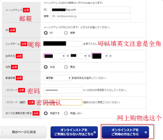 按提示填写资料,邮箱,ID,昵称,出生年月,性别,密码,密码确认,这些都是必填的。需要说的是昵称可以写拼音,注意填写的时候是全角就可以了。填写好后,按照图片提示点击右下角蓝色,进入下一步。