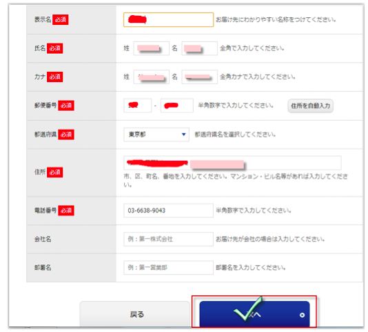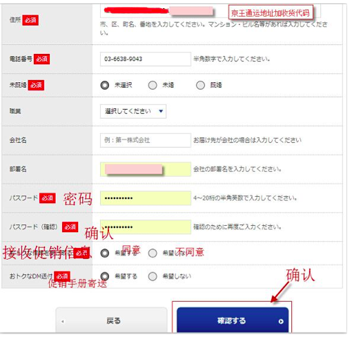 地址按照京王的自己仓库地址填就可以,一定加上自己的收货代码。填好后点蓝色框确认继续。